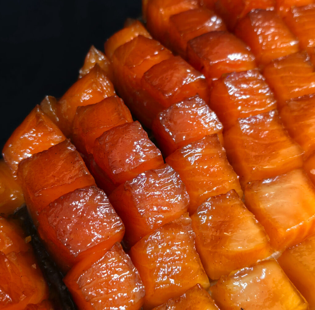 Our version of candied salmon is finished with a Bourbon-Maple glaze — a warm, rounded maple sweetness with subtle bourbon depth, applied to our cold-smoked Ukola salmon.